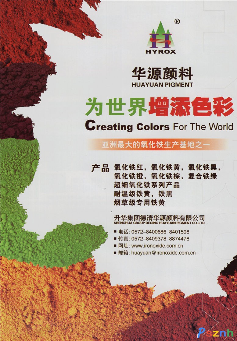 浙江華源顏料股份有限公司 氧化鐵紅 氧化鐵黃 氧化鐵黑 氧化鐵橙點(diǎn)擊:944 查看原圖![]() ![]() ![]() 浙江華源顏料股份有限公司 地址:浙江省德清縣鐘管工業(yè)區(qū) 電話:0572-8400686 傳真:0572-8409378 郵編:313220 網(wǎng)址:www.ironoxide.com.cn 郵箱:huayuan@ironoxide.com.cn |