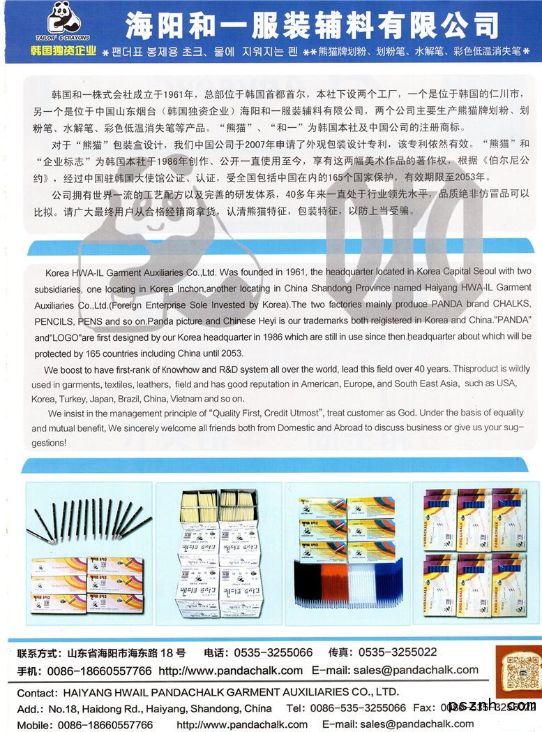 | 經營范圍: | 生產服裝剪裁用劃粉、畫筆及其相關產品,并銷售公司上述所列自產產品。(依法須經批準的項目,經相關部門批準后方可開展經營活動) | ||