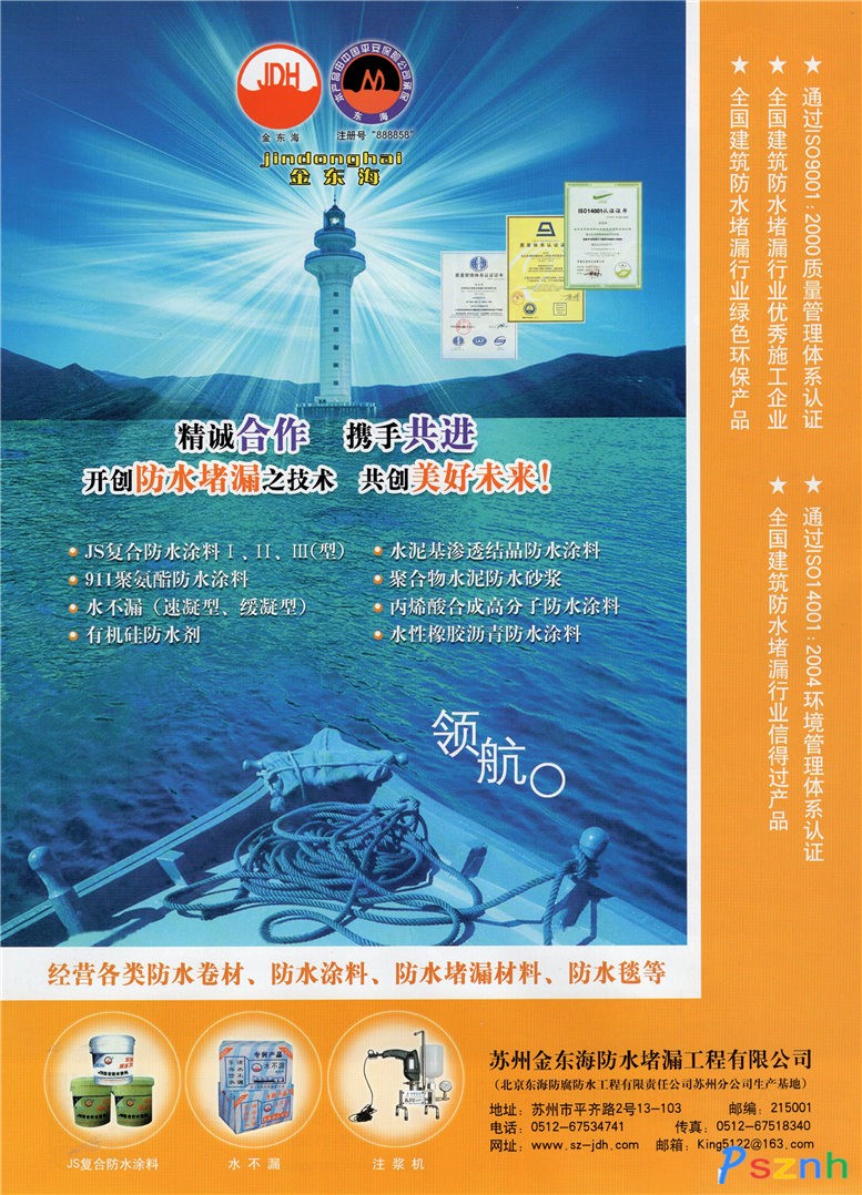 蘇州金東海防水堵漏工程有限公司_防水材料_防水涂料_防水防腐施工點擊:1638 查看原圖![]() ![]() ![]() 地址:江蘇省蘇州市三香路990號蘇州中材非金屬礦業(yè)設(shè)計院1004室