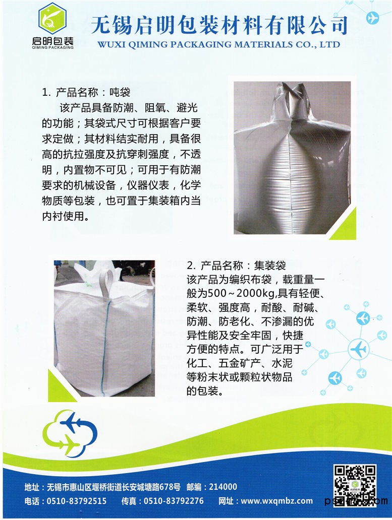 無錫啟明包裝材料有限公司 噸袋系列_25kg包裝系列_防靜電包裝系列點擊:745 查看原圖![]() ![]() ![]() 聯(lián)系電話