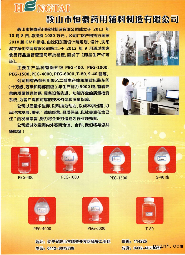 鞍山市恒泰藥用輔料制造有限公司 PEG系列 聚山梨酯80 S-40酯