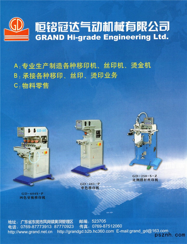東莞市恒銘冠達(dá)氣動(dòng)機(jī)械有限公司 移印機(jī) 絲印機(jī) 燙金機(jī)點(diǎn)擊:530 查看原圖![]() ![]() ![]() 地址:廣東東莞鳳崗黃洞管理區(qū) 電話(huà):(0769)87773913 傳真:87512060 郵編:523705 E-mail:grand@vip.sina.com |