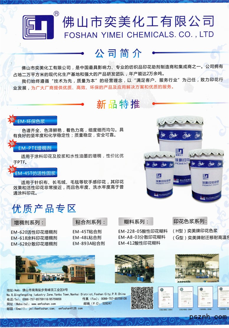 廣東奕美化工科技有限公司 增稠劑 印花色漿 粘合劑點擊:617 查看原圖![]() ![]() ![]() 廣東奕美化工科技有限公司