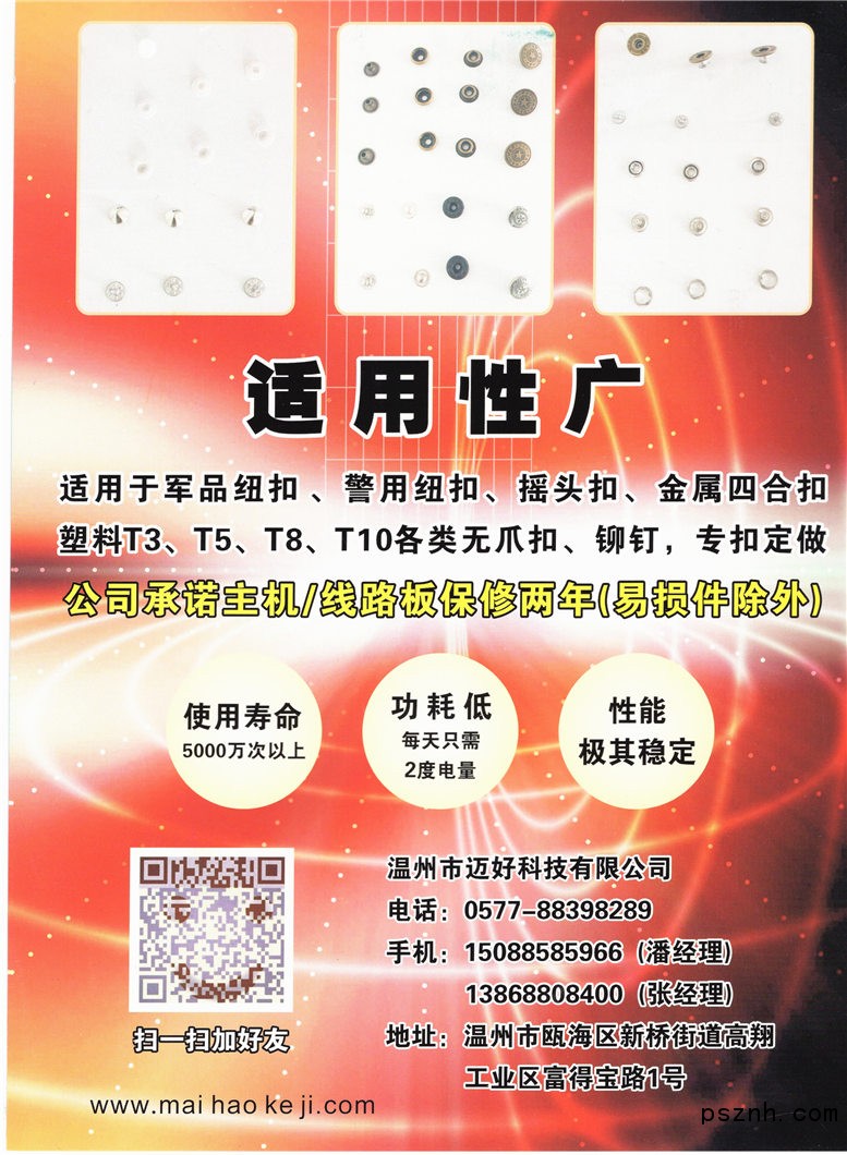 溫州市邁好科技有限公司 全自動送扣釘扣機_磁動力釘扣機_氣動力釘扣機點擊:1494 查看原圖![]() ![]() ![]() 溫州市邁好科技有限公司瀏覽196