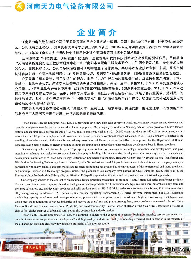 | 經(jīng)營范圍: | 干式變壓器、油浸式電力變壓器、箱式變電站、高低壓成套設備的生產(chǎn)、銷售及售后服務;電力變壓器配件的銷售及售后服務;從事貨物和技術的進出口業(yè)務# | ||
