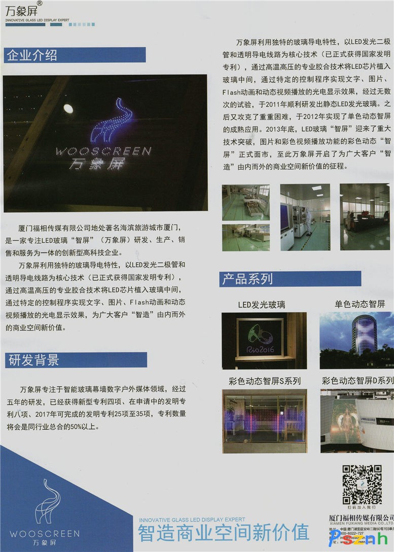 廈門福相傳媒有限公司 萬(wàn)象智屏 彩色動(dòng)態(tài)智屏 單色動(dòng)態(tài)智屏 LED發(fā)光玻璃點(diǎn)擊:734 查看原圖![]() ![]() ![]() 電話: 4006022727