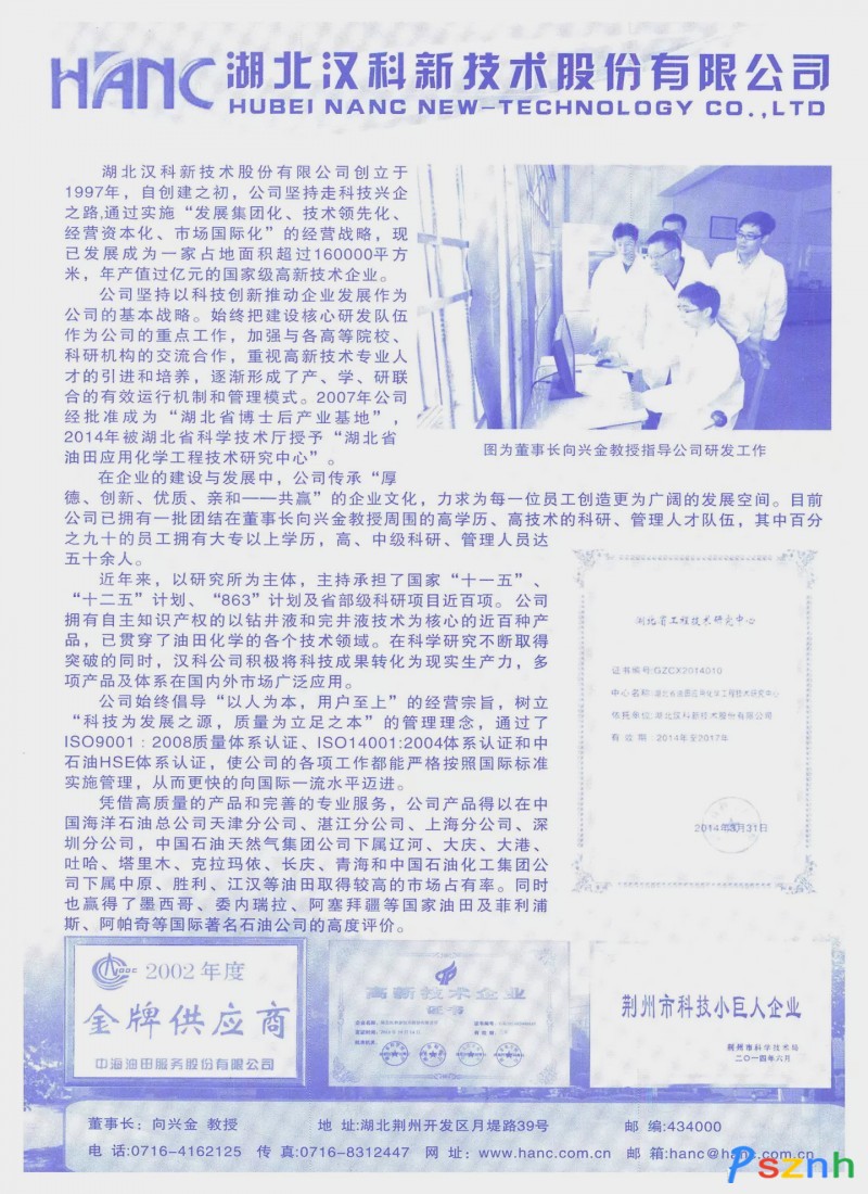 湖北漢科新技術(shù)股份有限公司 鉆井液 完井液點擊:457 查看原圖![]() ![]() ![]() 地址:湖北荊州開發(fā)區(qū)月堤路39號