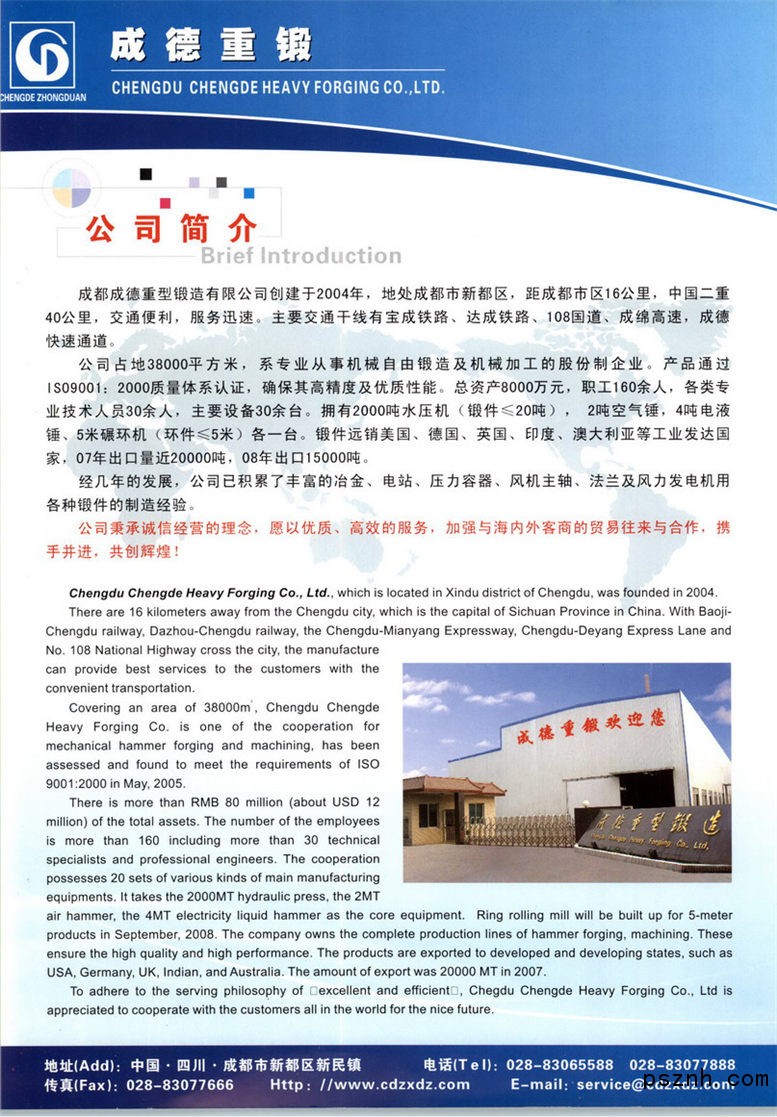 公司名稱:成都成德重型鍛造有限公司 聯(lián)系人:鄧雨野 移動電話:13880998700 聯(lián)系電話:028-83075639 傳真:028-83066386 聯(lián)系地址:成都市新都區(qū)新民鎮(zhèn)金牛村 郵編: 電子郵箱:china.manufactures@yahoo.com 公司商鋪:http://shop.cnsb.cn/index-423875.html