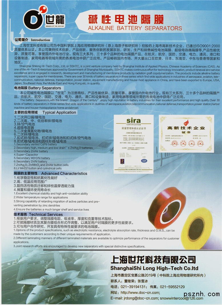 上海世龍科技有限公司 堿性電池隔膜 聚烯烴熱收縮材料 聚丙烯無紡布點擊:623 查看原圖![]() ![]() ![]() 聯(lián)系人: 周江松