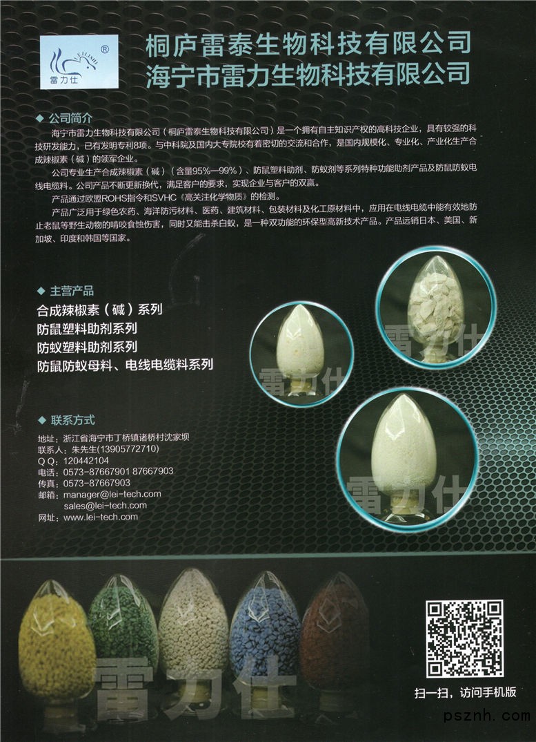| 經(jīng)營范圍: | 生物防污產(chǎn)品技術(shù)開發(fā);辣椒素(堿)、防鼠防蟻塑料助劑制造、加工。 | ||
