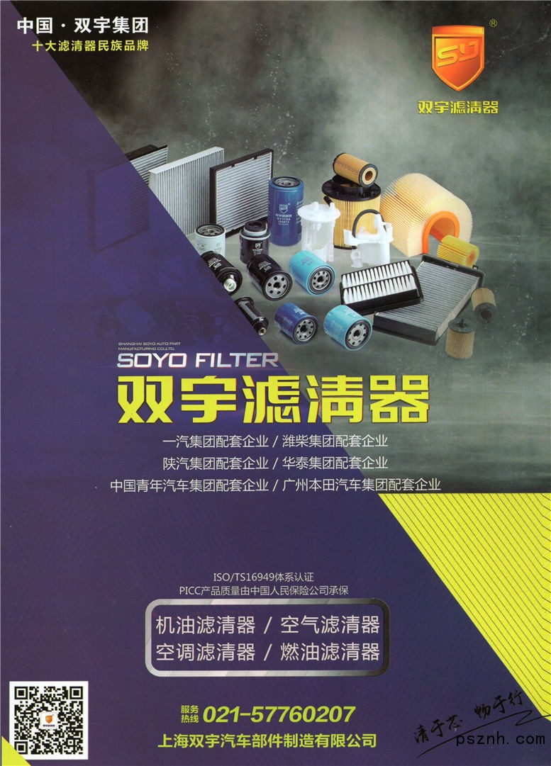 上海雙宇汽車部件制造有限公司 汽車濾清器 機(jī)油濾 汽油濾 空氣濾 空調(diào)濾點(diǎn)擊:765 查看原圖![]() ![]() ![]() 上海雙宇汽車部件制造有限公司