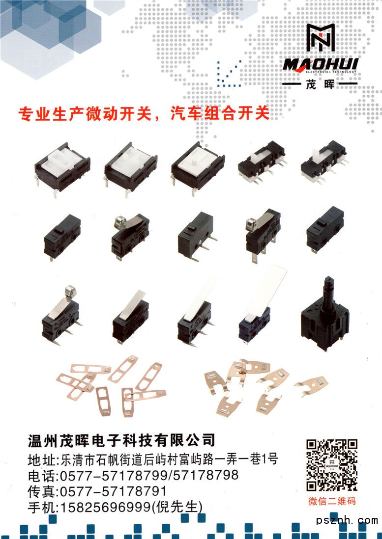 溫州茂暉電子科技有限公司 微動(dòng)開關(guān)、汽車玻璃升降開關(guān)、撥動(dòng)開關(guān)、進(jìn)口鈹青銅、銀觸點(diǎn)點(diǎn)擊:526 查看原圖![]() ![]() ![]() 地址 : 中國(guó) 浙江 樂清市石帆街道后嶼村一弄一巷一號(hào)