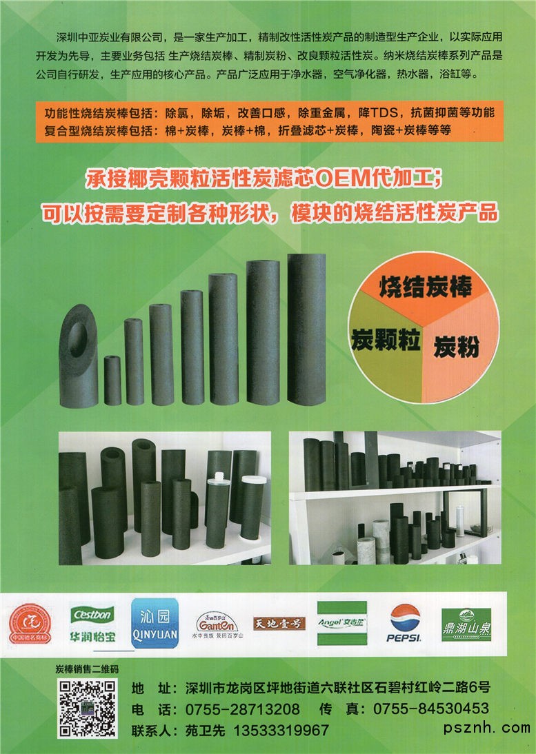 | 經(jīng)營范圍: | 凈水器材、空氣凈化濾材的研發(fā)應(yīng)用與銷售;國內(nèi)貿(mào)易、貨物及技術(shù)進(jìn)出口。^燒結(jié)活性炭棒濾芯、阻垢炭棒濾芯、殺菌炭棒濾芯、除重金屬炭棒濾芯、復(fù)合活性碳棒濾芯、以及其它活性炭燒結(jié)的技術(shù)研發(fā)、生產(chǎn)與銷售;椰殼活性炭、煤質(zhì)活性炭、木質(zhì)活性炭及炭材料的深加工和其新型材料的研發(fā)及銷售。 | ||