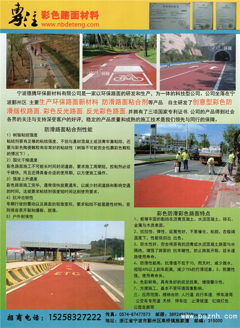 | 經(jīng)營范圍: | 環(huán)保新材料、新能源材料、彩色路面材料、化工產(chǎn)品及原料(危險(xiǎn)化學(xué)品除外)的批發(fā)、零售、研發(fā),道路工程、建筑裝飾工程、地坪工程、園林綠化工程的設(shè)計(jì)、施工,交通設(shè)施的施工。 | ||