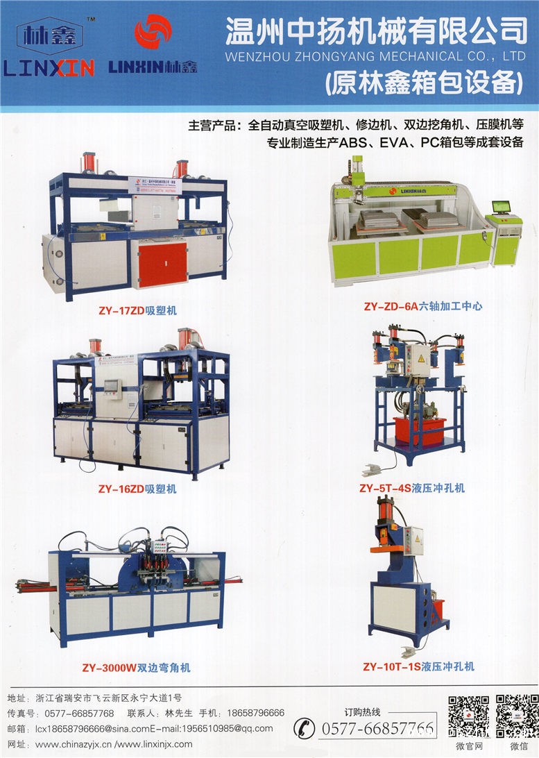 溫州中揚(yáng)機(jī)械有限公司 箱包機(jī)械_箱包設(shè)備_ 箱包吸塑機(jī)點擊:522 查看原圖![]() ![]() ![]() 電話:0577-66857766