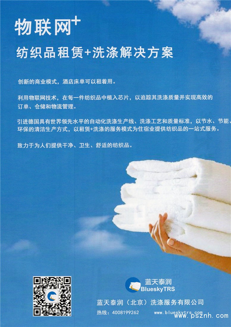 | 公司簡介: | 藍天清科隸屬于北京藍天清科控股有限公司,是一家為住宿業(yè)提供紡織品租賃+洗滌服務整體解決方案的企業(yè)。