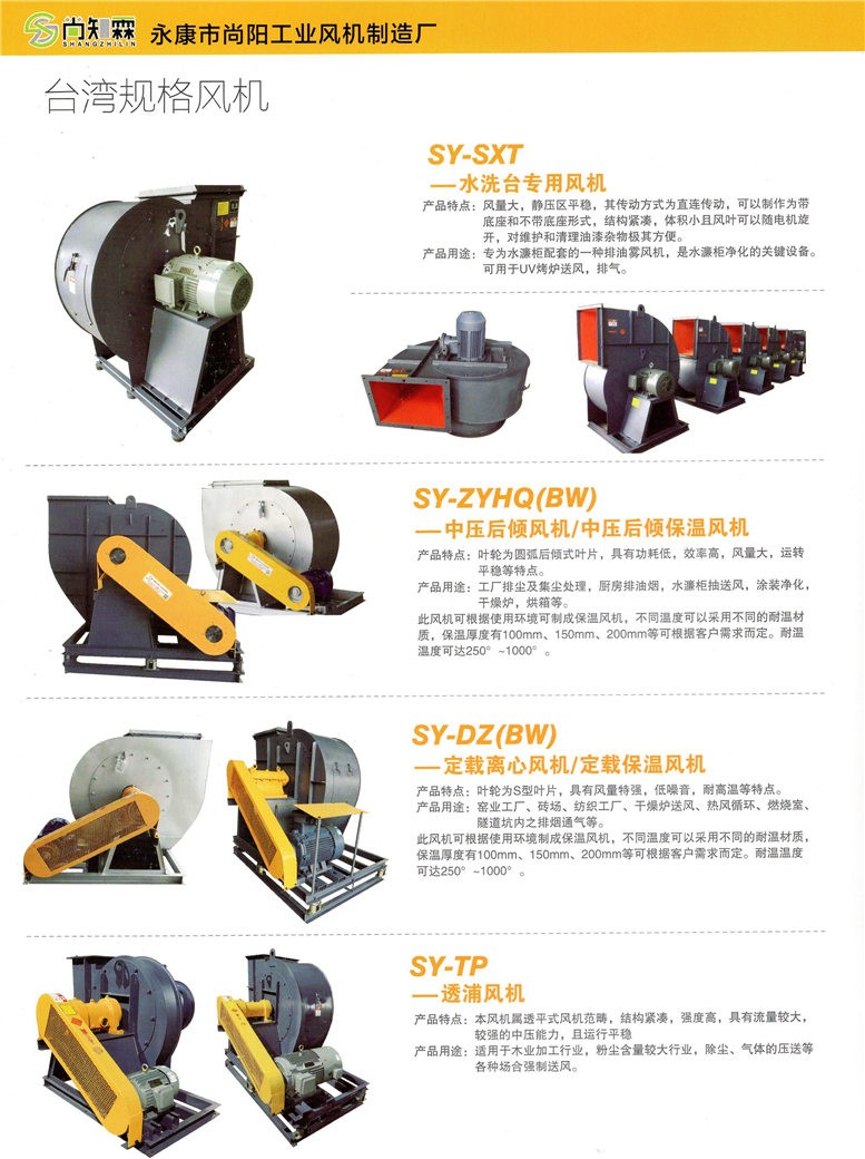 永康市尚陽(yáng)工業(yè)風(fēng)機(jī)制造廠 離心風(fēng)機(jī) 軸流風(fēng)機(jī) 高溫插入式風(fēng)機(jī) 直板后傾風(fēng)機(jī) 中壓雙吸口風(fēng)機(jī) 定載雙吸口風(fēng)機(jī) 透浦風(fēng)機(jī) 定載離心風(fēng)機(jī)/定載保溫風(fēng)機(jī) 水洗臺(tái)專(zhuān)用風(fēng)機(jī) 中壓后傾風(fēng)機(jī)/中壓后傾