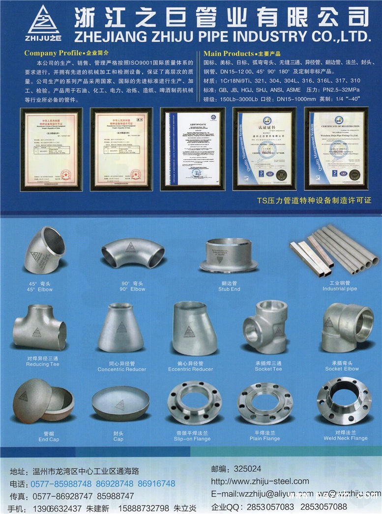 公司簡(jiǎn)介:  浙江之巨管業(yè)有限公司我公司具體地址位于溫州市龍灣區(qū)永中街道中心工業(yè)區(qū)通海路,歡迎各位新老客戶來(lái)我公司參觀指導(dǎo)工作,,我們主要經(jīng)營(yíng)制造、加工、銷售:管道配件、管件、五金配件;銷售:鋼管、鋼板、泵、閥門、五金制品、不銹鋼制品、標(biāo)準(zhǔn)件、法蘭;貨物進(jìn)出口、技術(shù)進(jìn)出口。