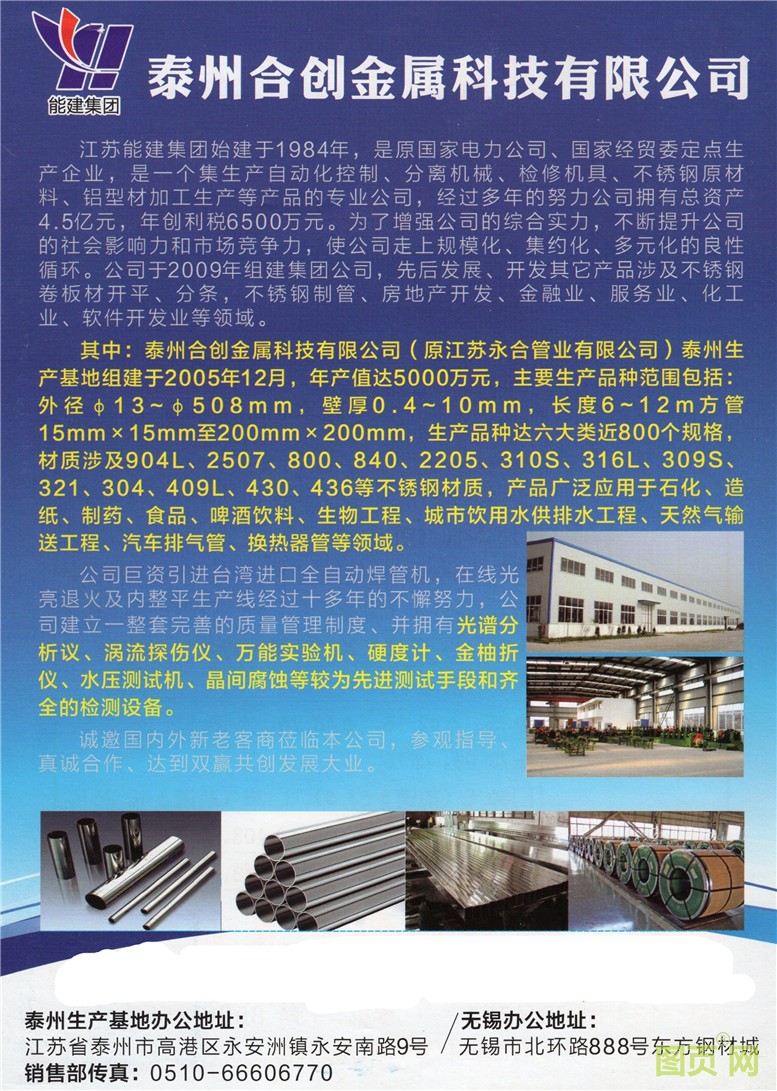 泰州合創(chuàng)金屬科技有限公司(原江蘇永合管業(yè)有限公司)是中外合資企業(yè),項目總投資1.2 億人民幣,注冊資本3240 萬人民幣,占地面積3.3 萬平方米。