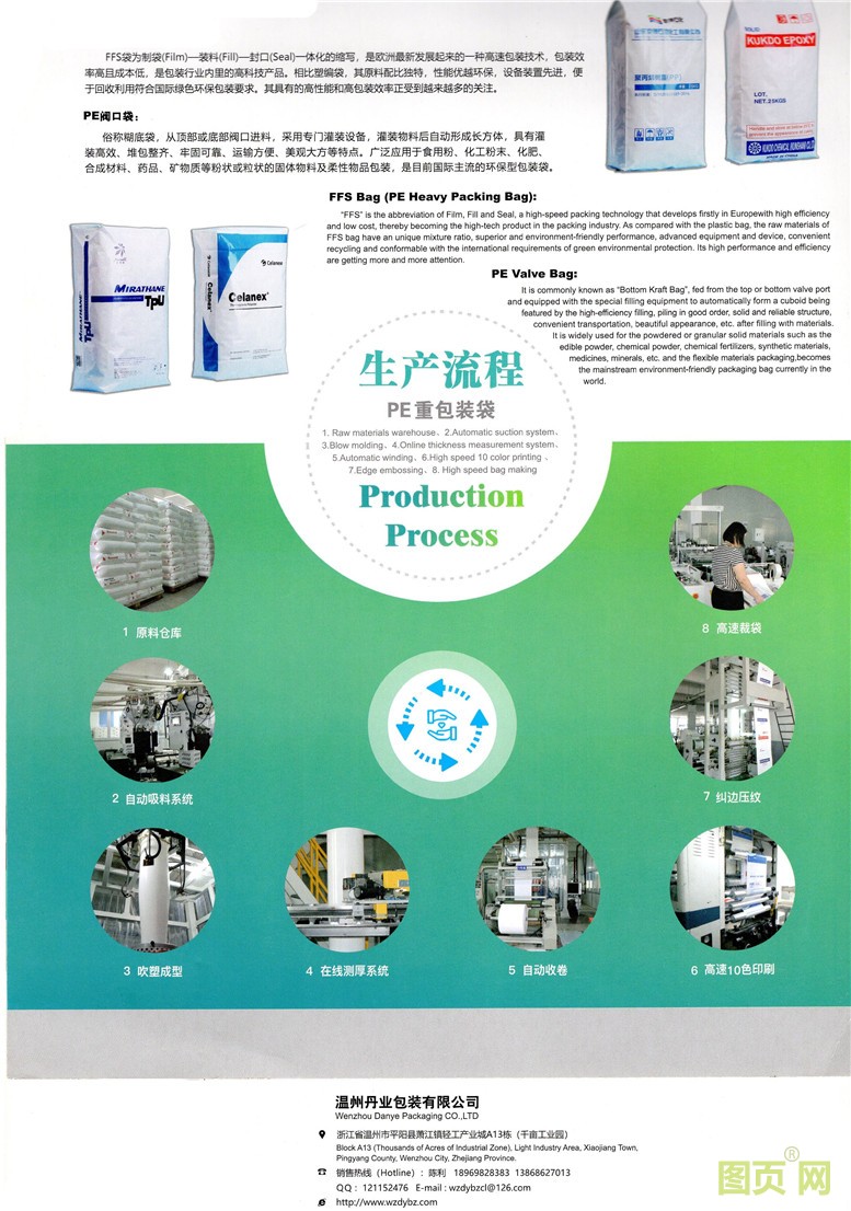 | 公司簡介: | 溫州丹業(yè)包裝有限公司 創(chuàng)建于2009年,位于有“中國塑編城”和“中國信用鎮(zhèn)”之稱的溫州蕭江。作為國內(nèi)15家能專業(yè)生產(chǎn)FFS重包裝袋之一的公司,總資產(chǎn)將近3000萬元。擁有現(xiàn)代化標(biāo)準(zhǔn)廠房5000多平米,在職員工100多名,其中管理人員20名,技術(shù)人員25名,質(zhì)檢部門7名,公司大、中專以上學(xué)歷人員占71%。 目前擁有兩條FFS袋全自動生產(chǎn)線,包括性能的三層共擠吹膜機(jī)組,以及先進(jìn)的專業(yè)印刷機(jī)、壓花—插邊機(jī)、電腦高速制袋機(jī)等。目前正在計(jì)劃引進(jìn)德國巴頓菲爾三層共擠吹膜機(jī),讓企業(yè)產(chǎn)能和產(chǎn)品性能再上一個(gè)臺階。企業(yè)通過了ISO9001:2008國際質(zhì)量體系和《出口危險(xiǎn)貨物包裝容器質(zhì)量許可證》,擁有完整、科學(xué)的質(zhì)量管理體系。設(shè)立了專職獨(dú)立的質(zhì)檢部,擁有先進(jìn)的摩擦系數(shù)儀、落鏢測試儀、拉力測試儀等質(zhì)檢設(shè)備。從原材料進(jìn)廠檢驗(yàn)到成品出廠檢驗(yàn),每一個(gè)環(huán)節(jié)都確保質(zhì)量穩(wěn)定可靠。 公司主要產(chǎn)品是FFS袋、PE閥口袋,產(chǎn)品廣泛用于化工粒料、粉料的包裝,石化塑料粒子以及飼料產(chǎn)品等包裝,以及農(nóng)化肥產(chǎn)品領(lǐng)域。國內(nèi)大型石化企業(yè),如上海SECCO公司、上海石化、揚(yáng)子石化、揚(yáng)子巴斯夫公司、中海殼牌公司、中沙石化等,全部要求采用這一新型包裝,在歐美工業(yè)發(fā)達(dá)國家,它已經(jīng)廣泛地替代了傳統(tǒng)的復(fù)合編織袋而成為合成樹脂包裝領(lǐng)域的主流。 溫州丹業(yè)包裝有限公司 始終堅(jiān)持以規(guī)范的生產(chǎn)理念、專業(yè)的技術(shù)、平實(shí)的價(jià)格、穩(wěn)定的資源為您提供良好的服務(wù)。 電話:0577-64763643