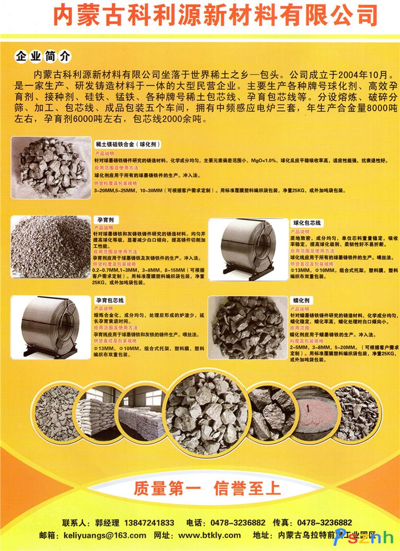 | 經(jīng)營范圍: | 各種類型球化劑、鎂合金、硅粒、孕育劑、包芯線生產(chǎn)加工(危險化工品除外);各種鎂合金、硅鐵、硅粒、稀土合金、稀土金屬、鋼材、農(nóng)牧產(chǎn)品、鑄造產(chǎn)品銷售;進出口貿(mào)易;(依法須經(jīng)批準(zhǔn)的項目,經(jīng)相關(guān)部門批準(zhǔn)后方可開展經(jīng)營活動;)。 | ||