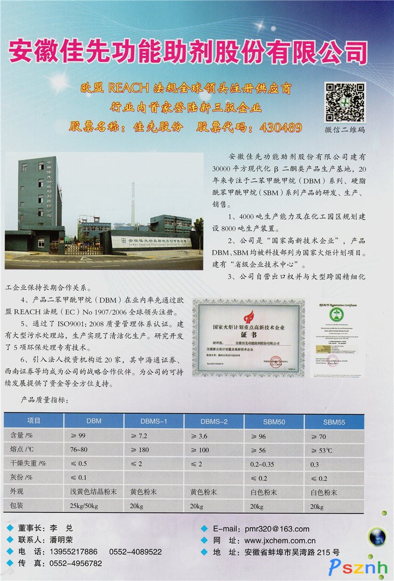 安徽佳先功能助劑股份有限公司 _二苯甲酰甲烷_硬脂酰苯甲酰甲烷_新型環(huán)保融雪劑點(diǎn)擊:2142 查看原圖![]() ![]() ![]() 國內(nèi)貿(mào)易部:0552-4089522