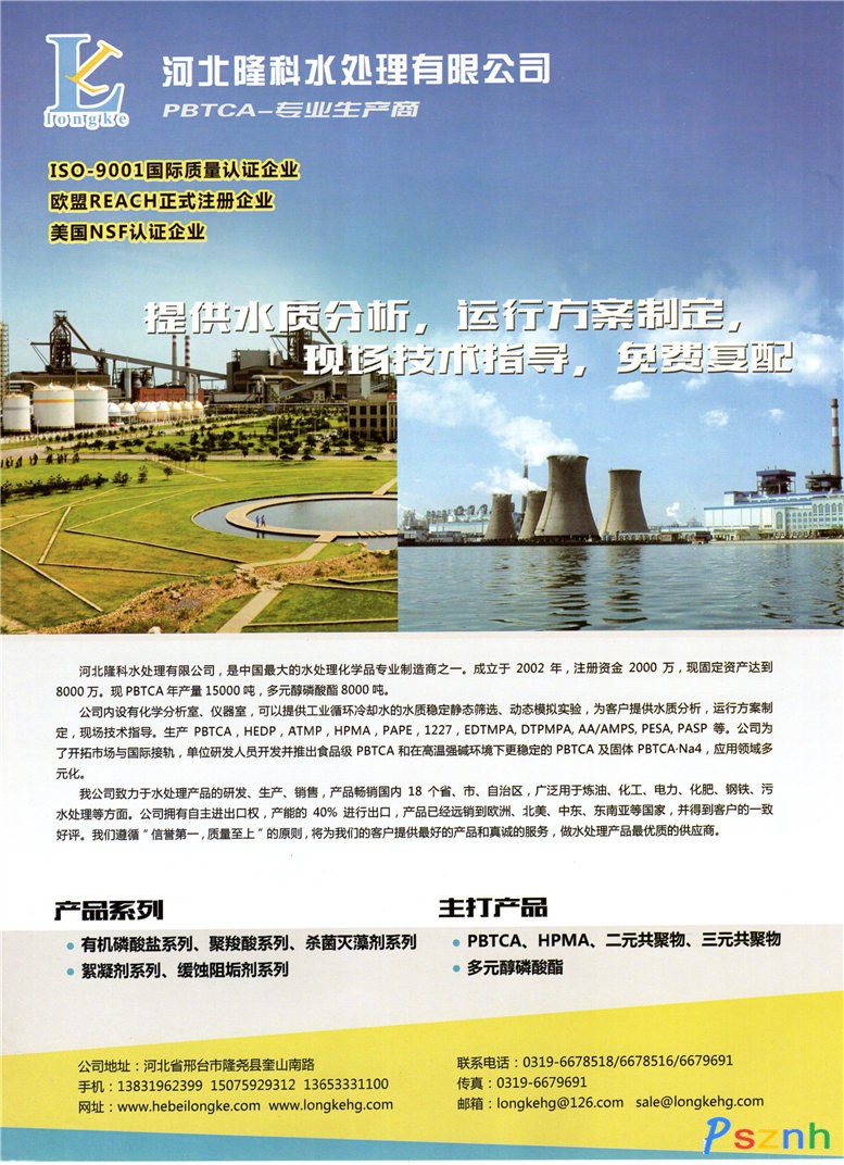 | 經(jīng)營(yíng)范圍: | 工業(yè)循環(huán)冷卻水處理、工業(yè)污水、城市生活污水處理;2-膦酸基-1,2,4-三羧基丁烷銷售及本企業(yè)相關(guān)的產(chǎn)品的出口業(yè)務(wù)(國(guó)家限定公司經(jīng)營(yíng)或出口的商品及技術(shù)除外)。(依法須經(jīng)批準(zhǔn)的項(xiàng)目,經(jīng)相關(guān)部門批準(zhǔn)后方可開(kāi)展經(jīng)營(yíng)活動(dòng)) | ||