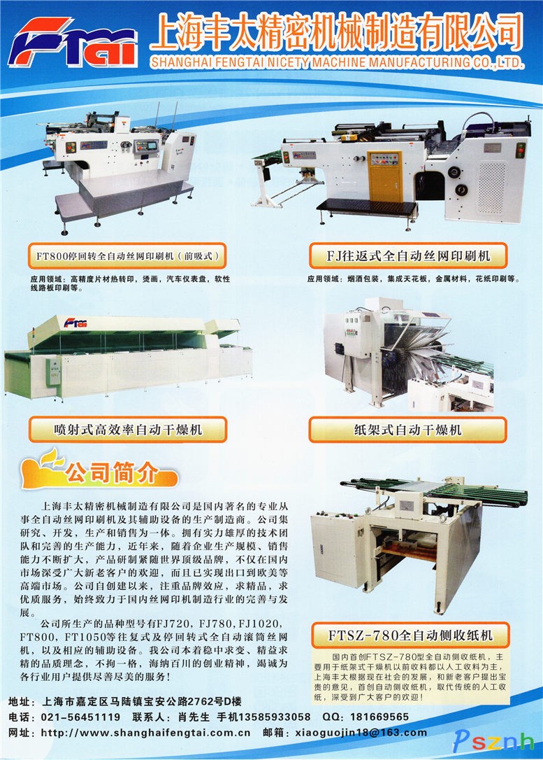 上海豐太精密機械制造有限公司 FT800停回轉(zhuǎn)全自動絲網(wǎng)印刷機 FTZJ型紙架式自動干燥機 全自動磨刀機點擊:1676 查看原圖![]() ![]() ![]() 上海豐太精密機械制造有限公司