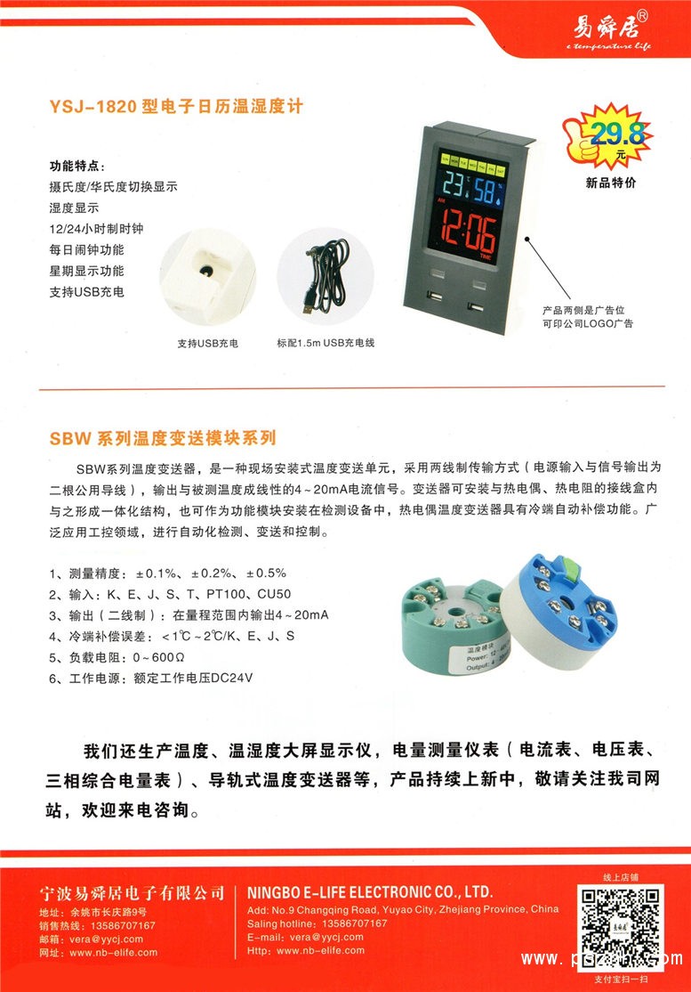 寧波易舜居電子有限公司 電子溫濕度計 電子定時器 電流電壓儀表 溫度變送器點擊:1068 查看原圖![]() ![]() ![]() 銷售熱線: 13586707167
