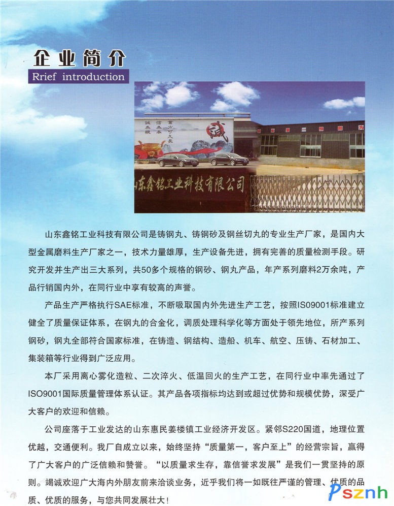 山東鑫銘工業(yè)科技有限公司是鑄鋼丸、鑄鋼砂及鋼絲切丸的專業(yè)生產(chǎn)廠家,是國內(nèi)大型金屬磨料生產(chǎn)廠家之一,技術(shù)力量雄厚,生產(chǎn)設(shè)備先進(jìn),擁有完善的質(zhì)量檢測手段。研究開發(fā)并生產(chǎn)出三大系列,共50多個規(guī)格的鋼砂、鋼丸產(chǎn)品,年產(chǎn)系列磨料6萬余噸,產(chǎn)品行銷國內(nèi)外,在同行業(yè)中享有較高的聲譽(yù)。     產(chǎn)品生產(chǎn)嚴(yán)格執(zhí)行SAEJ444標(biāo)準(zhǔn),不斷吸取國內(nèi)外先進(jìn)生產(chǎn)工藝,按照ISO9001標(biāo)準(zhǔn)建立健全了質(zhì)量保證體系,在鋼丸的合金化,調(diào)質(zhì)處理科學(xué)化等方面處于領(lǐng)先地位,所產(chǎn)系列鋼砂,鋼丸全部符合國家標(biāo)準(zhǔn),在鑄造、鋼結(jié)構(gòu)、造船、機(jī)車、航空、壓鑄、石材加工、集裝箱等行業(yè)得到廣泛應(yīng)用。     本廠采用離心霧化造粒、二次淬火、低溫回火的生產(chǎn)工藝,在同行業(yè)中率先通過了ISO900l國際質(zhì)量管理體系認(rèn)證。其產(chǎn)品各項指標(biāo)均達(dá)到或超過SAEJ444標(biāo)準(zhǔn)要求,并擁有完善的質(zhì)量檢測體系和手段。目前,公司具備技術(shù)領(lǐng)先優(yōu)勢和規(guī)模優(yōu)勢,深受廣大客戶的歡迎和信賴。     本廠座落于山東省惠民縣姜樓工業(yè)園。緊鄰濟(jì)220國道,地理位置優(yōu)越,交通便利。我廠自成立以來,始終堅持"質(zhì)量第一,客戶至上"的經(jīng)營宗旨,贏得了廣大客戶的廣泛信賴和贊譽(yù)。 "以質(zhì)量求生存,靠信譽(yù)求發(fā)展"是我們一貫堅持的原則。     竭誠歡迎廣大海內(nèi)外朋友前來洽談業(yè)務(wù),今后我們將一如既往 以嚴(yán)謹(jǐn)?shù)墓芾?、?yōu)良的品質(zhì)、優(yōu)質(zhì)的服務(wù),與您共同發(fā)展壯大。
