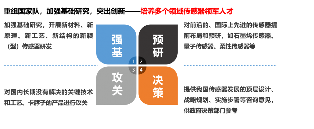 1、重組國(guó)家隊(duì),加強(qiáng)基礎(chǔ)研究,突出創(chuàng)新——培養(yǎng)多個(gè)領(lǐng)域傳感器領(lǐng)軍人才。