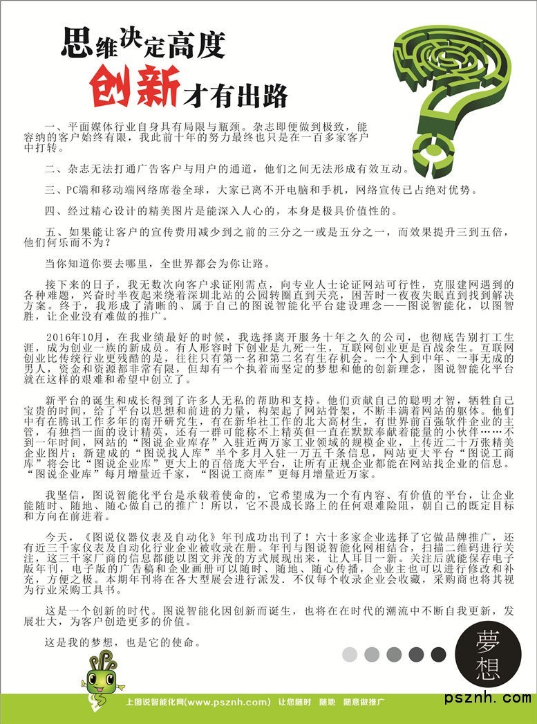 今天,圖頁網(wǎng)旗下年刊成功出刊了!六十多家企業(yè)選擇了它做品牌推廣,還有近三千家儀表及自動(dòng)化行業(yè)企業(yè)被收錄在冊(cè)。年刊與圖說智能化網(wǎng)相結(jié)合,掃描二維碼進(jìn)行關(guān)注,這三千家廠商的信息都能以圖文并茂的方式展現(xiàn)出來,讓人耳目一新。關(guān)注后就能保存電子版年刊,電子版的廣告稿和企業(yè)畫冊(cè)可以隨時(shí)、隨地、隨心傳播,企業(yè)主也可以進(jìn)行修改和補(bǔ)充,方便之極。本期年刊將在各大型展會(huì)進(jìn)行派發(fā).不僅每個(gè)收錄企業(yè)會(huì)收藏,采購商也將其視為行業(yè)采購工具書。