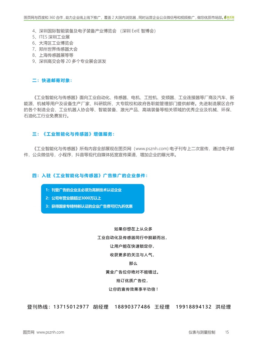 三:《工業(yè)智能化與傳感器》增值服務(wù): 《工業(yè)智能化與傳感器》所有內(nèi)容全部展現(xiàn)在圖頁網(wǎng)(m.rts.org.cn)電子刊專上二次宣傳,通過電子郵件,公眾微信號,小程序,抖音等現(xiàn)代自媒體拓寬宣傳渠道,增加企業(yè)的曝光率。