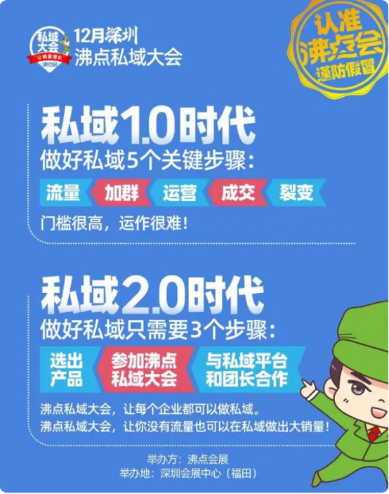 私域1.0時代,做好私域5個關鍵步驟:流量-加群-運營-成交-裂變門檻很高,運作很難。私域2.0時代,做好私域只需要3個步驟:選出產(chǎn)品-參加沸點私域大會-與私域平臺和團長合作。沸點私域大會,讓每個企業(yè)都可以做私域。