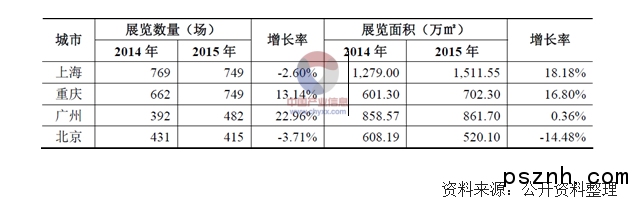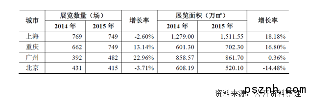 近年來(lái),重慶作為西部中心城市,會(huì)展產(chǎn)業(yè)積極發(fā)展,展覽數(shù)量及展覽面積增幅維持在較高水平。2014 年及2015 年北京、上海、廣州和重慶所舉辦的展會(huì)數(shù)量及展覽面積具體統(tǒng)計(jì)如下: