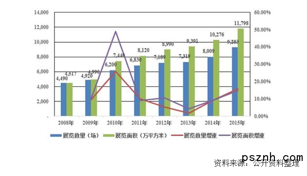 經(jīng)過(guò)十余年的快速發(fā)展,我國(guó)會(huì)展業(yè)已初具規(guī)模。2015 年全國(guó)共舉辦各類(lèi)展會(huì)9,283場(chǎng),展覽面積11,798 萬(wàn)平方米,會(huì)展經(jīng)濟(jì)直接產(chǎn)值達(dá)到4,803.1 億元人民幣,約占全國(guó)國(guó)內(nèi)生產(chǎn)總值的0.71%,占全國(guó)第三產(chǎn)業(yè)增加值的1.41%。2008 年至2015年,國(guó)內(nèi)會(huì)展場(chǎng)次數(shù)量和展覽面積均實(shí)現(xiàn)了穩(wěn)步增長(zhǎng),具體情況如下: