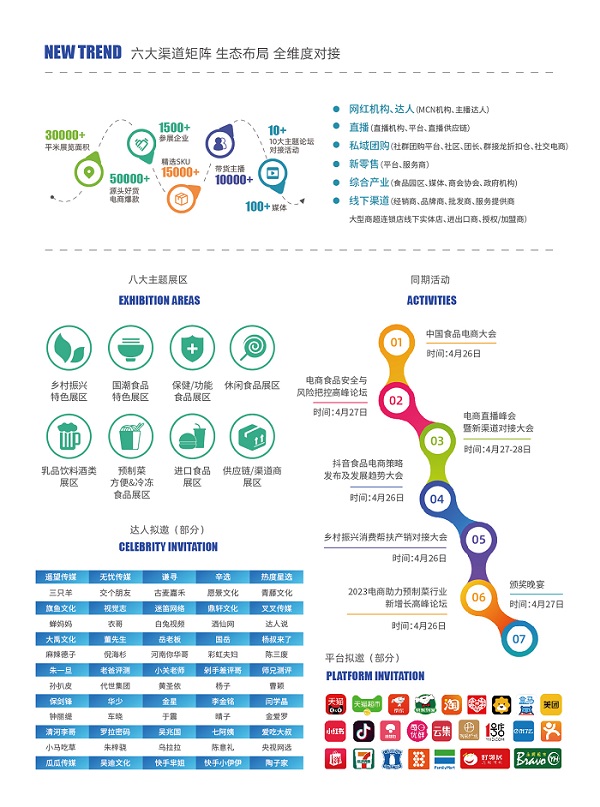目的: 本次博覽會以【與“食”俱進(jìn)·共鏈共生】為主題,現(xiàn)場超40000㎡面積,通過“主題論壇+行業(yè)交流+展覽展示+渠道選品”等形式,在品牌展示、科技合作、行業(yè)分享、產(chǎn)品交易等方面打造食品電商產(chǎn)業(yè)綜合服務(wù)交流平臺。