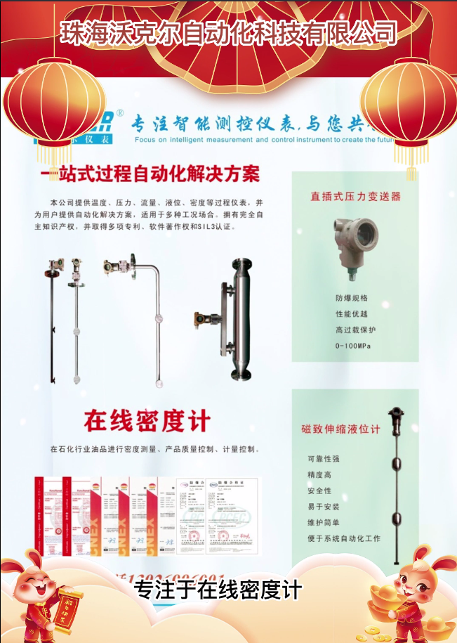 珠海沃克爾自動化科技有限公司專注于在線密度計、酒精濃度計、磁致伸縮液位計、超聲波液位計、壓力變送器、溫度變送器、流量計、氧化鋯分析儀等過程控制儀表開發(fā)和生產(chǎn),2022年公司圓滿完成了工作任務和管理目標,在疫情困境中謀發(fā)展,在挑戰(zhàn)中尋機遇。面對取得的業(yè)績,我們在感到由衷的自豪和驕傲,同時更進一步增強了我們對公司事業(yè)必勝的信心和勇氣。