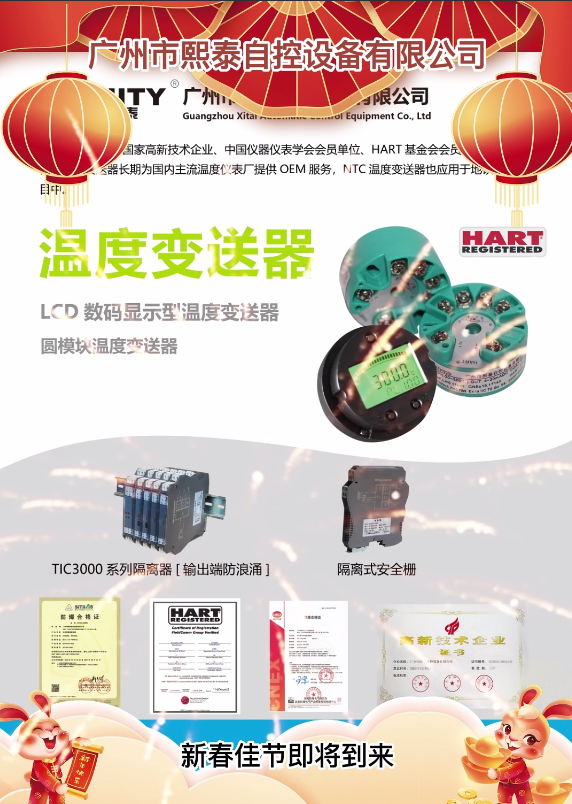 新春佳節(jié)即將到來,我謹代表熙泰自控公司向大家致以新春的祝福和誠摯的問候!熙泰自控作為研發(fā)生產(chǎn) 智能溫度變送器  信號變換器  安全柵 的國家高新技術(shù)企業(yè),“研發(fā)與制造穩(wěn)定可靠的控制產(chǎn)品”為企業(yè)使命的專業(yè)化公司,向關(guān)心、支持和幫助“風(fēng)雨同舟”發(fā)展的各位用戶、社會各界朋友表示衷心的感謝!         2022年,我們凝心聚力、奮斗不息,公司蓬勃發(fā)展。其中智能溫度變送器長期為國內(nèi)主流溫度儀表廠提供OEM服務(wù),NTC溫度變送器也應(yīng)用于地鐵及高鐵項目中。