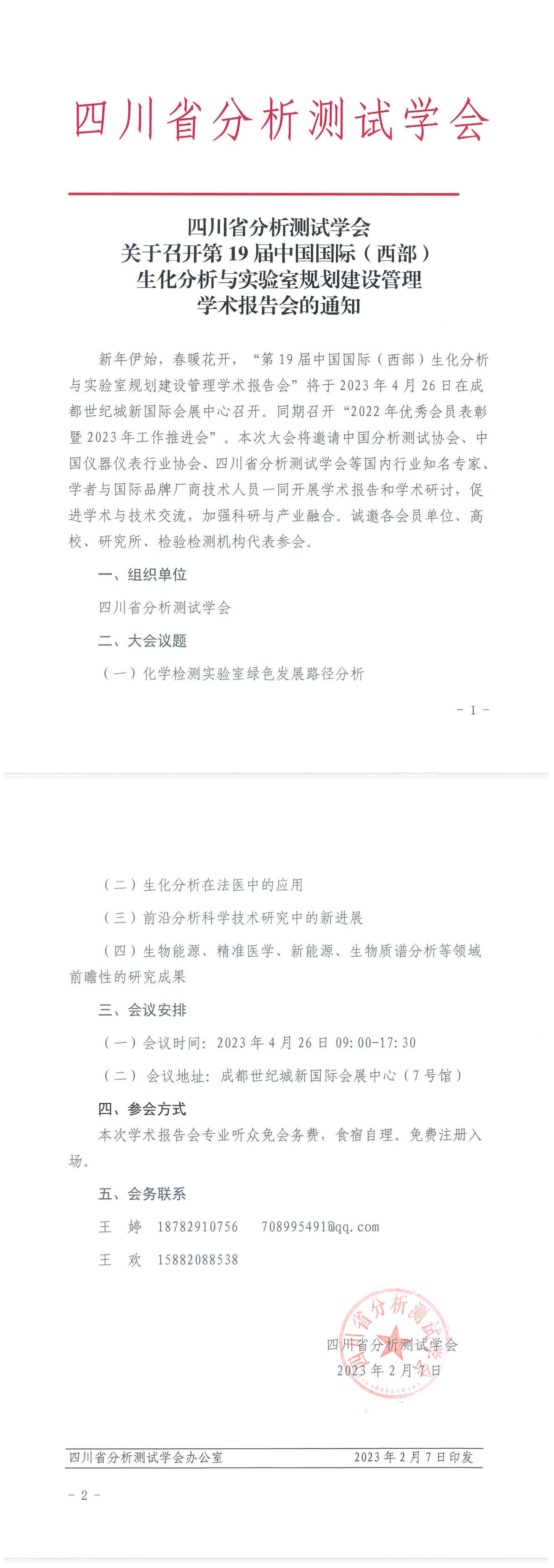 新年伊始,春暖花開,“第19屆中國國際(西部)生化分析與實驗室規(guī)劃建設管理學術報告會”將于2023年4月26日在成都世紀城新國際會展中心召開。同期召開“2022年優(yōu)秀會員表彰暨2023年工作推進會”。本次大會將邀請中國分析測試協(xié)會、中國儀器儀表行業(yè)協(xié)會、四川省分析測試學會等國內(nèi)行業(yè)知名專家、學者與國際品牌廠商技術人員一同開展學術報告和學術研討,促進學術與技術交流,加強科研與產(chǎn)業(yè)融合。誠邀各會員單位、高校、研究所、檢驗檢測機構代表參會。