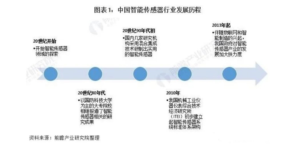 ⒈中國智能傳感器行業(yè)發(fā)展加速傳感器自誕生以來,大致經(jīng)歷了結(jié)構(gòu)型、固體型、智能型三個階段,隨著各類技術(shù)的進(jìn)步,前兩類傳感器逐漸無法滿足對數(shù)據(jù)采集、處理等流程的需求,融合了AI技術(shù)的智能傳感器開始受到關(guān)注。20世紀(jì)開始,我國開始智能傳感器領(lǐng)域的探索。20世紀(jì)80年代-2010年,我國對于智能傳感器的研究不斷深入。2013年起,智能傳感器行業(yè)扶持政策陸續(xù)出臺,重點(diǎn)為使傳感器及智能儀器儀表實(shí)現(xiàn)微型化、數(shù)字化、模塊化、網(wǎng)絡(luò)化;2017年,工信部制定了《智能傳感器產(chǎn)業(yè)三年行動計(jì)劃(2017-2019年)》,明確傳感器產(chǎn)業(yè)的發(fā)展目標(biāo)和方向。伴隨物聯(lián)網(wǎng)和智能制造的興起,智能傳感器得到了廣泛地關(guān)注。