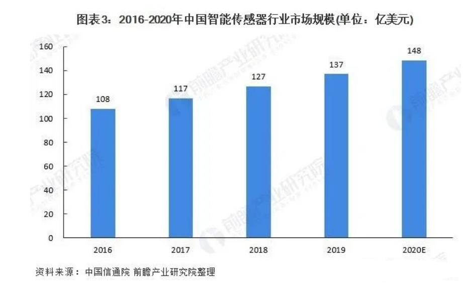 ⒊中國智能傳感器市場規(guī)模持續(xù)上升根據(jù)中國信通院的數(shù)據(jù),中國智能傳感器市場規(guī)模從2015年的106億美元上升至2019年的137億美元,我國智能傳感器產(chǎn)業(yè)生態(tài)逐漸趨于完備,設(shè)計(jì)制造,封測等重點(diǎn)環(huán)節(jié)均有骨干企業(yè)布局。2020年,中國智能傳感器行業(yè)市場規(guī)模在148億美元左右。