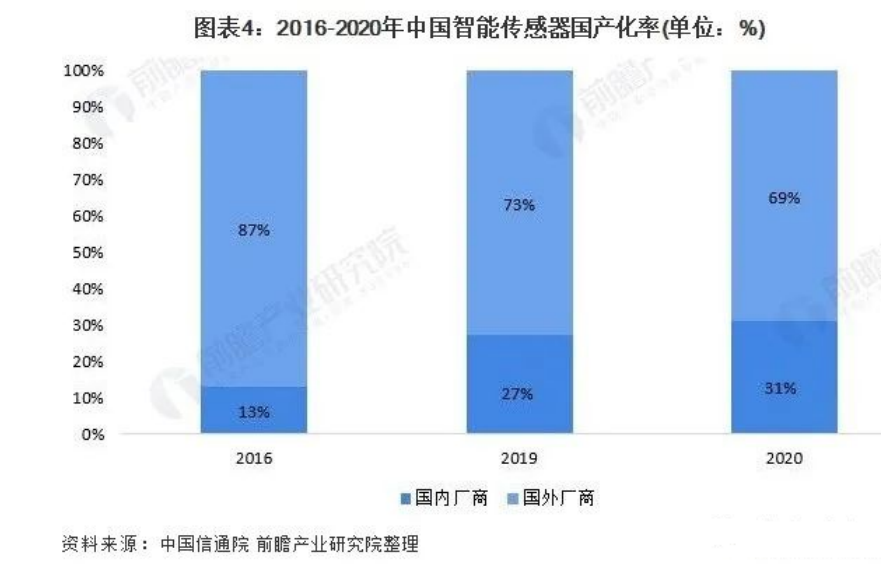 ⒋智能傳感器國產(chǎn)化率穩(wěn)步提升我國國內(nèi)廠商智能傳感器總產(chǎn)值占比從2016年的13%快速提升到2020年的31%,顯著高于行業(yè)增速,未來隨著國內(nèi)廠商技術(shù)持續(xù)迭代、產(chǎn)品線進(jìn)一步豐富、市場認(rèn)知度持續(xù)提升,智能傳感器市場國產(chǎn)化率有望進(jìn)一步提高。
