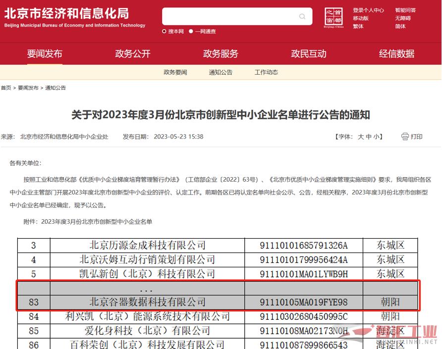 近日,北京市經(jīng)信局公布了“2023年度3月份北京市創(chuàng)新型中小企業(yè)名單”,經(jīng)過相關(guān)部門的評(píng)價(jià)、認(rèn)定,谷器數(shù)據(jù)成功入選。這也是谷器數(shù)據(jù)首次榮獲創(chuàng)新型中小企業(yè)認(rèn)定!