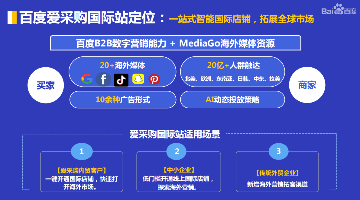 愛采購國際站,簡單粗暴的理解就是:愛采購的海外版或者叫國際版,他對(duì)標(biāo)的是阿里巴巴國際站。是百度基于多年互聯(lián)網(wǎng)營銷經(jīng)驗(yàn)沉淀+AI和大數(shù)據(jù)能力, 結(jié)合現(xiàn)有大量商家的海外營銷訴求,推出的一款低經(jīng)營成本、快速入門的海外營銷產(chǎn)品;旨在幫助有外貿(mào)需求及能力的B2B中小企業(yè)快速建立海外獲客通道。