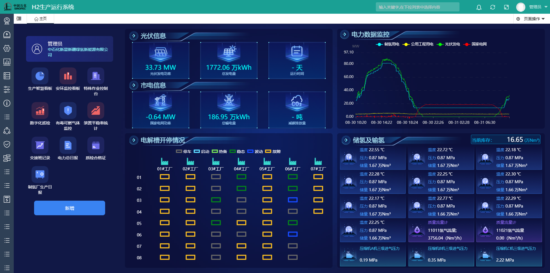 通過全生命周期的仿真智慧模擬驗證,系統(tǒng)滿足項目對光伏波動的自動快速響應需求,優(yōu)選用電策略、開槽策略及源網(wǎng)荷儲用控制策略。依據(jù)現(xiàn)場工藝設備情況,實現(xiàn)全過程的自感知、自診斷、自學習、自尋優(yōu)、自適應極端天氣變化及用氫變化,達成一鍵啟停、全自動無人操作的功能。