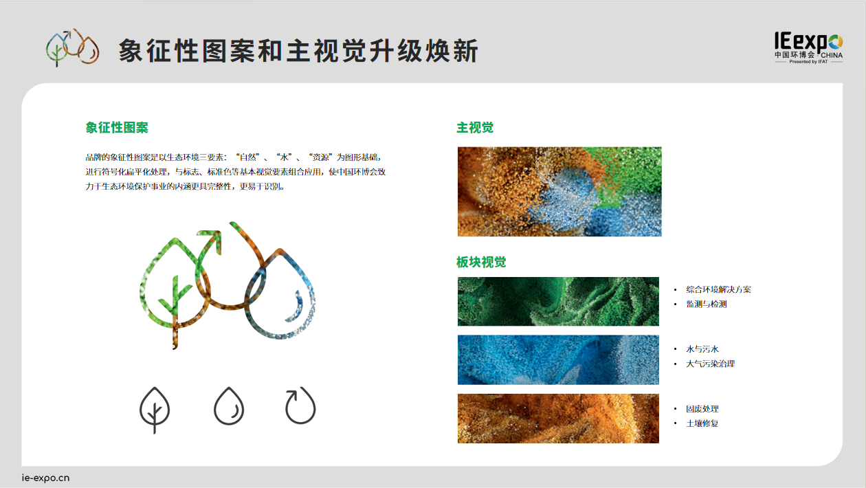 回顧中國(guó)環(huán)博會(huì)IE expo歷經(jīng)的品牌形象演變,不難發(fā)現(xiàn)每次變化都緊密關(guān)聯(lián)著品牌發(fā)展的不同階段。2014年,品牌主視覺(jué)使用互相融合的具象化環(huán)保元素,充分展現(xiàn)了中國(guó)環(huán)博會(huì)IE expo展示環(huán)境污染治理技術(shù)的平臺(tái)屬性,并一直沿用至今。而此次品牌形象升級(jí),將象征性圖案抽象化符號(hào)化,主視覺(jué)使用代表不同產(chǎn)業(yè)板塊的粒子融合圖案,則凸顯了中國(guó)環(huán)博會(huì)IE expo致力于發(fā)掘純粹的、面向未來(lái)的環(huán)境技術(shù)的決心,以及展現(xiàn)了中國(guó)環(huán)博會(huì)IE expo作為旗艦平臺(tái)的品牌形象和對(duì)高質(zhì)量發(fā)展的承諾。