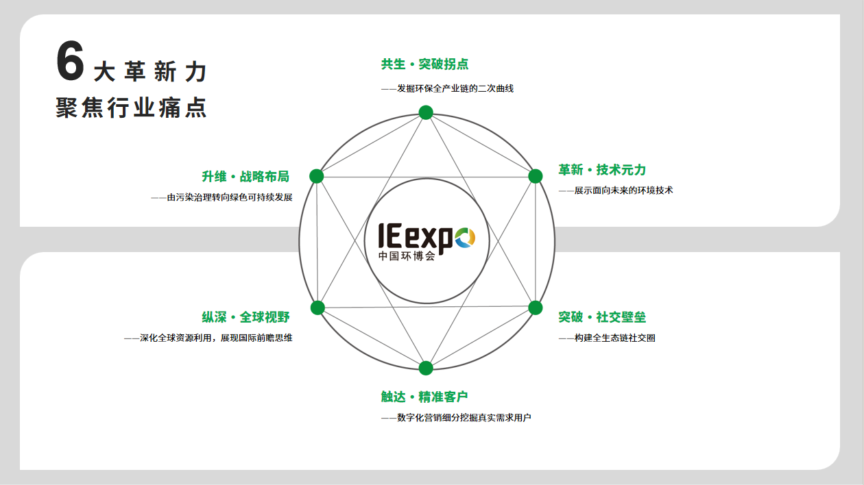 為適應(yīng)當(dāng)前的發(fā)展形勢(shì),中國(guó)環(huán)博會(huì)IE expo將持續(xù)推進(jìn)六大能力的自我革新,即:一、拓展數(shù)智化等跨界產(chǎn)業(yè)與傳統(tǒng)環(huán)保產(chǎn)業(yè)的共融交集,提升平臺(tái)“共生力”,發(fā)掘環(huán)保全產(chǎn)業(yè)鏈內(nèi)的發(fā)展第二曲線;二、由污染治理轉(zhuǎn)向綠色可持續(xù)發(fā)展,培育在碳中和領(lǐng)域的戰(zhàn)略布局,提升平臺(tái)“升維力”;三、展出面向未來(lái)的環(huán)境技術(shù),提升平臺(tái)“革新力”,提升環(huán)??萍紕?chuàng)新動(dòng)能;四、深化IFAT全球資源的利用,展現(xiàn)國(guó)際前瞻思維,提升平臺(tái)“視野力”;五、創(chuàng)造平臺(tái)打破創(chuàng)新鏈、產(chǎn)業(yè)鏈、資金鏈、人才鏈的融合壁壘,提升平臺(tái)“社交力”;六、深化數(shù)字營(yíng)銷(xiāo)體系,配合發(fā)起關(guān)鍵營(yíng)銷(xiāo)戰(zhàn)役,精準(zhǔn)聚攏真實(shí)需求用戶人群,提升平臺(tái)“觸達(dá)力”。