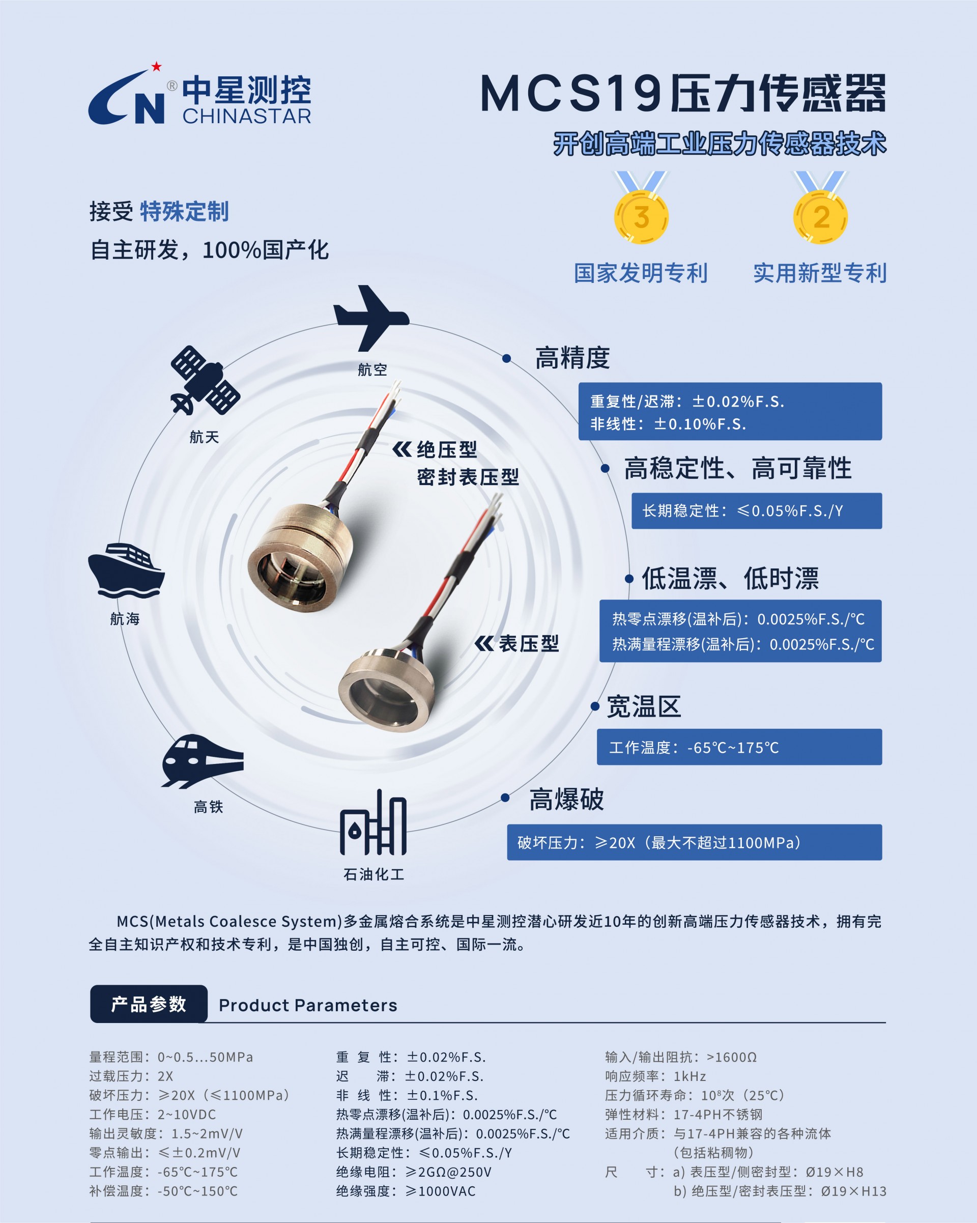 中星測控潛心研發(fā)多年的MCS(多金屬熔合系統(tǒng))高端壓力傳感器,擁有完全自主知識產(chǎn)權(quán)和技術(shù)專利,自主可控、100%國產(chǎn)化,填補了國內(nèi)高端壓力傳感器市場的空白,解決了“卡脖子”問題。與其他常見的壓力傳感器相比,它具有高精度、高穩(wěn)定性、高可靠性、低溫漂、低時漂 、寬溫區(qū)、高爆破等特點。