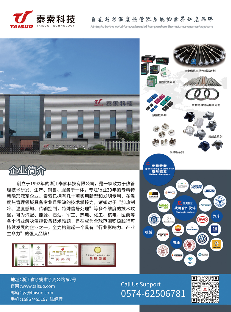 在此次世環(huán)會(huì)中,浙江泰索科技有限公司作為溫度熱管理系統(tǒng)的領(lǐng)軍企業(yè),借助《儀表與測(cè)量控制》雜志的平臺(tái),成功展示了其在溫度控制領(lǐng)域的先進(jìn)技術(shù)和解決方案。自1992年成立以來,泰索科技始終專注于溫度熱管理系統(tǒng)的研發(fā)與創(chuàng)新,致力于為全球溫度控制領(lǐng)域相關(guān)產(chǎn)業(yè)的可持續(xù)發(fā)展做出貢獻(xiàn)。泰索科技擁有多項(xiàng)實(shí)用新型和發(fā)明專利,與國(guó)內(nèi)高等院校導(dǎo)師、材料學(xué)院教授、研究院專家等進(jìn)行長(zhǎng)期合作研發(fā),在熱管理前沿技術(shù)領(lǐng)域取得了豐碩成果,為公司帶來了長(zhǎng)期可持續(xù)增長(zhǎng)的發(fā)展動(dòng)力。公司在溫度熱管理領(lǐng)域具備專業(yè)且稀缺的技術(shù)掌控力,諸如“加熱制冷、溫度感知、傳輸控制,特殊信號(hào)處理”等多個(gè)維度的技術(shù)攻堅(jiān),可為汽配、能源、石油、軍工、熱電、化工、核電、醫(yī)藥等各個(gè)行業(yè)解決溫控設(shè)備技術(shù)難題。泰索科技的發(fā)展圍繞“制造工業(yè)、汽車工業(yè)、特種行業(yè)、品質(zhì)生活”四大核心模塊,產(chǎn)品包括溫度傳感器、溫控儀表、汽車尾氣傳感器核心部件、加長(zhǎng)鎧裝測(cè)溫電纜、超長(zhǎng)信號(hào)電纜、高端加熱電纜、新能源汽車電流傳感器等。通過對(duì)產(chǎn)品鏈條的豐富迭代以及比肩國(guó)際水準(zhǔn)的技術(shù)實(shí)力,泰索科技成為了世界五百強(qiáng)企業(yè)和中國(guó)央企的長(zhǎng)期合作供應(yīng)商,其足跡遍布全球各地,不斷刷新在行業(yè)細(xì)分領(lǐng)域的變革目標(biāo),成為溫度熱管理細(xì)分領(lǐng)域的領(lǐng)軍企業(yè)。